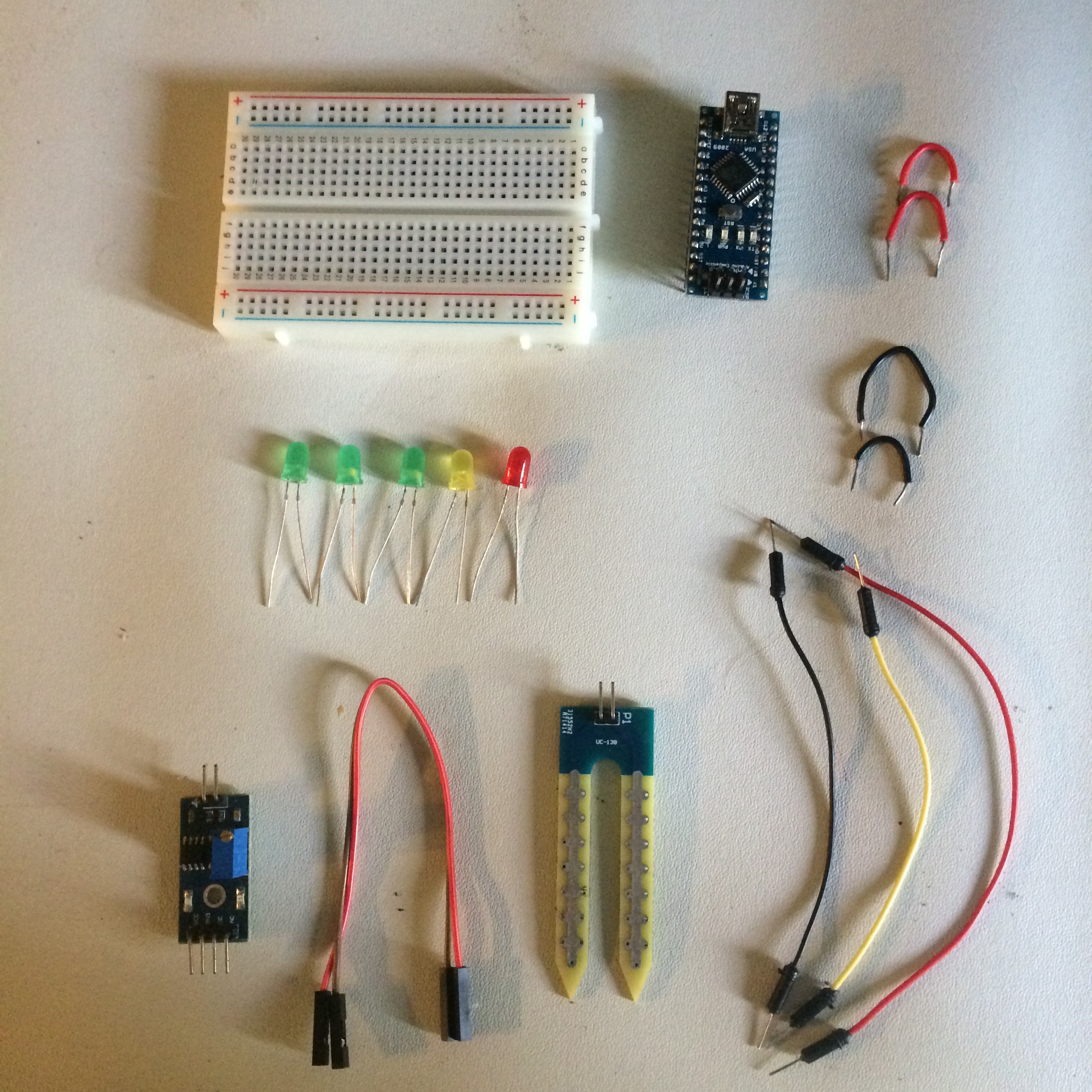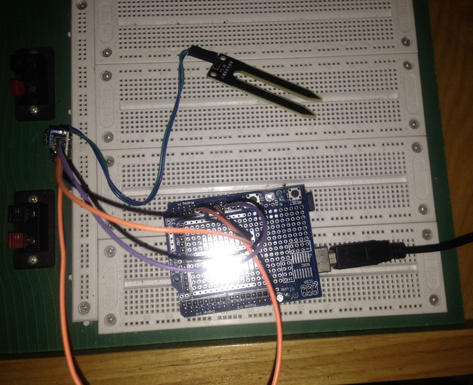Insert the probes of the sensor head into the soil to determine its moisture content and carefully adjust the preset vr1 so that voltage just above 3v is available at pin a1 of arduino board1 if the soil is wet enough.